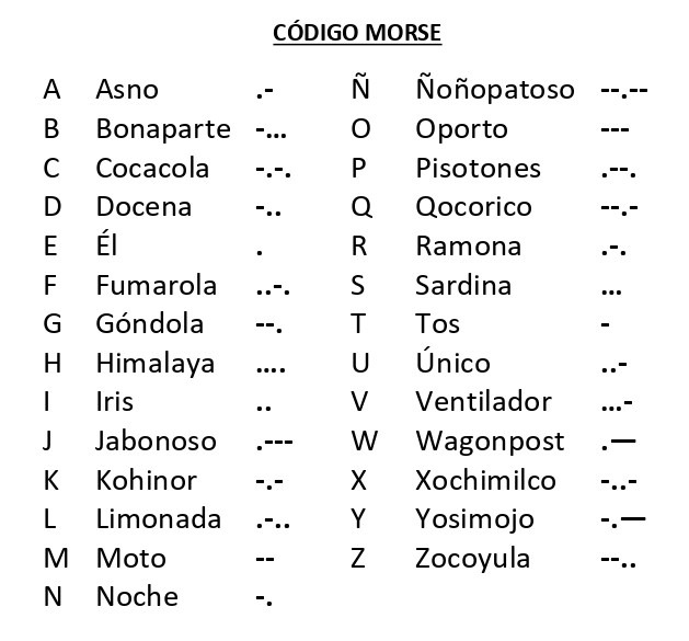 Una forma popular de recordar el código Morse es asociar cada letra con una palabra clave que comience con la misma letra. Por ejemplo, la letra «A» puede asociarse con la palabra «Asno», porque tiene las vocales «A» y «O», representadas por un punto y una raya.